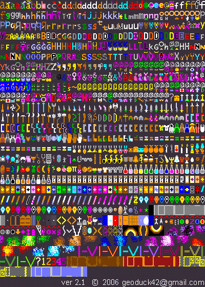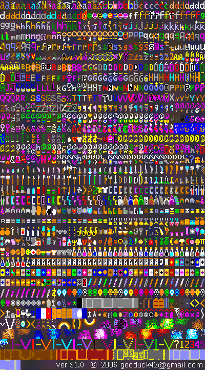 I love NetHack and its offshoot SlashEM. They are wonderful games with endless replay value, and the price can't be beat. Nevertheless, I always had a major problem with them: the default "all-ASCII" option just doesn't offer enough information for my taste, while the various existing tile options are either ugly, too big to fit nicely on the screen, or both. So... for my own amusement and convenience, for both versions I have created the Geoduck WinHack Tile Set Version 2.1 This is not a more elaborate and detailed tile set, ala AllegroHack or Falcon's Eye. Just the opposite; I've pared everything down even more to a tile size of 20 pixels high by 10 pixels wide, while using as small a palette of colors as possible, and whenever possible, incorporating a version of the original ASCII character into each tile. It's been reported to me that that some NetHackers out have found the result to be a useful cross between the default WinHack tiles and the original ASCII version. With the GTS copied into place, and the proper options added to your 'defaults.nh' file, a game of WinHack or Slash'EM should now display an entire level of the dungeon on your screen without any (serious) warping of the tiles, while still offering more information than ASCII about everything that you are seeing, stealing and slaughtering. I've tried to keep the eyestrain down to a minimum as well. While the color and size of the dungeon's living (or at least animate) inhabitants have been changed in the GTS set, and in most cases extra distinguishing features have been added, roughly 95% of the critters are still depicted by the same basic letter or symbol as they are in ASCII. (The other 5%, I couldn't resist a little artistic license...) I've tried to be as consistent as I can with regards to the size and color changes; whenever possible a monster's new hue(s) is somehow appropriate to its character or appearance, while the bigger a critter is 'in-game', usually the bigger is the letter depicting it. For example, a Mumak is still a 'q' in GTS, but it is now a big gray