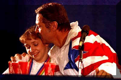 Kim receives a kiss from Bela at a press conference after the 1991 World