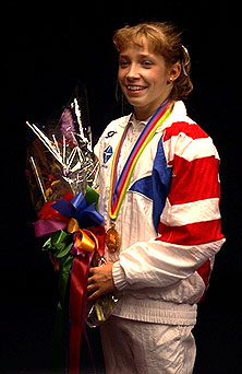 In the months preceding the 1992 Olympics, Kim was on top of the world. Kim held national and international medals in several reputation building events, and in September of 1991 at the age of fifteen, she was the first American, man or woman, to win the All-Around title at the World Gymnastics Championships (V-9.962, UB-9.937, BB-9.962, FX-9.987). With her amazing floor routine to Glenn Miller's "In The Mood", Kim brought the audience to their feet in Indianapolis and tears to the eyes of those of us watching at home. I still cry when I watch that floor exercise routine.