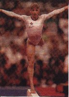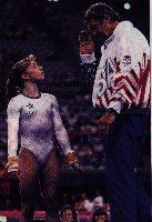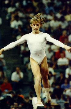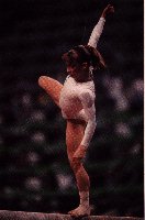 After weeks of intense scrutiny by the team selection committee, Kim and the rest of the team were finally in Barcelona. Thousands of fans packed the stands just to watch the gymnasts in podium training. On the first night of team competition for the women, Kim got off to a rough start. On Kim's first event of the night, the beam, she rushed her tumbling pass and found herself teetering on the edge of the beam. Gravity took over and Kim had no way of staying on. Suddenly, a move thashe had performed a thousand times in the gym and should have been automatic was just beyond her grasp. Stunned, Kim remounted the beam and finished the routine almost in a trance. With a pitiful score of 9.35, even Bela remarked that for Kim to make it to the all-around competition would be "remote". Even though Kim fought back with scores of 9.925 on floor, 9.9 on vault, and a 9.887 on bars, she stood in 32nd place after the compulsories and 5th on the American team. Kim would have to fight her way past her teammates Dominique Dawes and Kerri Strug since only the top three from each country can advance to the all-around. (Photo at left by Jill from Jack's Gymnastics Page) |