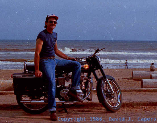 This is me with my 350cc Enfield Bullet on the Puri beach in 1985 (probably October). Ratna took the photograph. My apologies for the poor image quality. The photo is somewhat worse for wear.