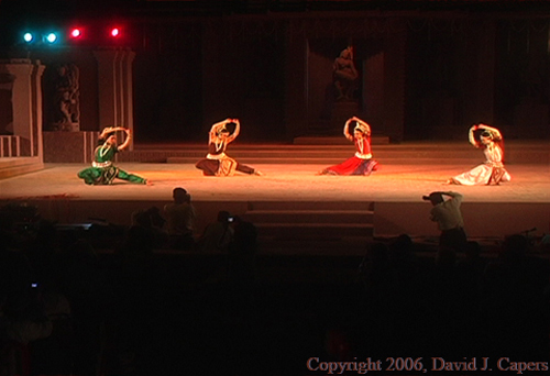 "V adya Pallavi," a flowering of the dance through "vadya" (pneumonics) rather than "svara" (melody). Danced here by Aimee Machiels, Ruth Nelson-Moore, Kristina Ching, and Mary Drew (left to right).