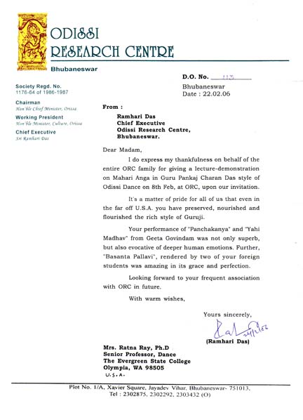Letter to Ratna Roy from Ramhari Das, Chief Executive, Odissi Research Centre, Bhubaneswar, Orissa. |