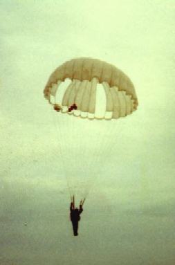 From left to right above, an example of a 5 gore TU, a 7 gore TU both military surplus 28 Ft parachutes and a Paracommander. This particular Paracommander is a design called an "Aztec". This was a PC owned by your beloved author. (This picture was taken on one of the Drop Zones at Fort Bragg, North Carolina sometime during the summer of 1968).
