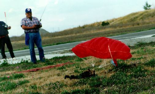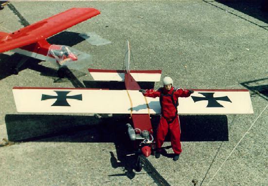 This is "Little Juan" as he originally came from England. The airplane he is leaning on is a Sweet Stick 40. His first 10 drops were made from this aircraft. It was a real chore dropping him from it.
