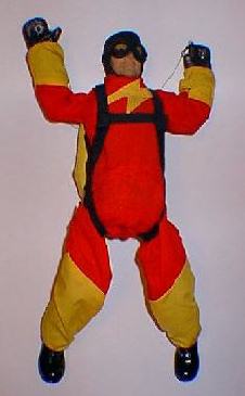 This is "Small Juan" who came into being because the jumpsuit that was made for "Little Juan" was too short in the legs. Therefore I had to shorten his legs about 1.5 inches. He also has a round green 36" diameter parachute. It is cut with a "Crossbow" type design.
