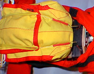 This shows the back pack and the release pins and switch harness. If you look closely you can see the yellow rubber bands that assist the pack tray in opening. The red portion of the pack lock wire is heat shirnk tubing to keep the lock wire from sticking into the pack tray. I used a cotton broadcloth material for Small Juan's jumpsuit and packtray.